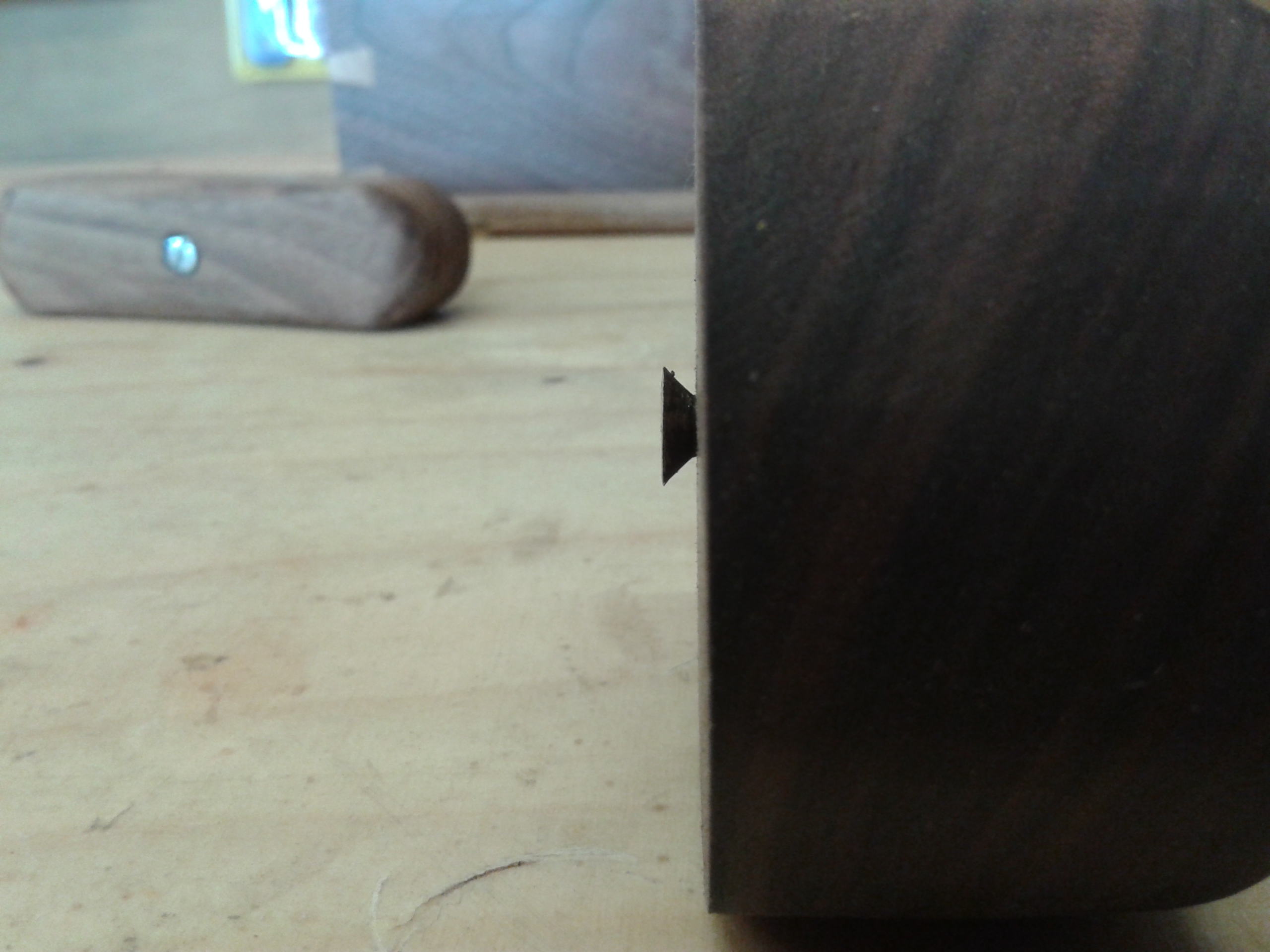 The circular marking gauge is even simpler. It consists of a circular lump of wood, shaped to fit the hand, and an old wood screw, filed down so that it has sharp edges. The wood is drilled in the centre to take the screw, and the gauge is adjusted by turn the screw with a screwdriver. With the head filed down, the screw acts as kind of cutting wheel.