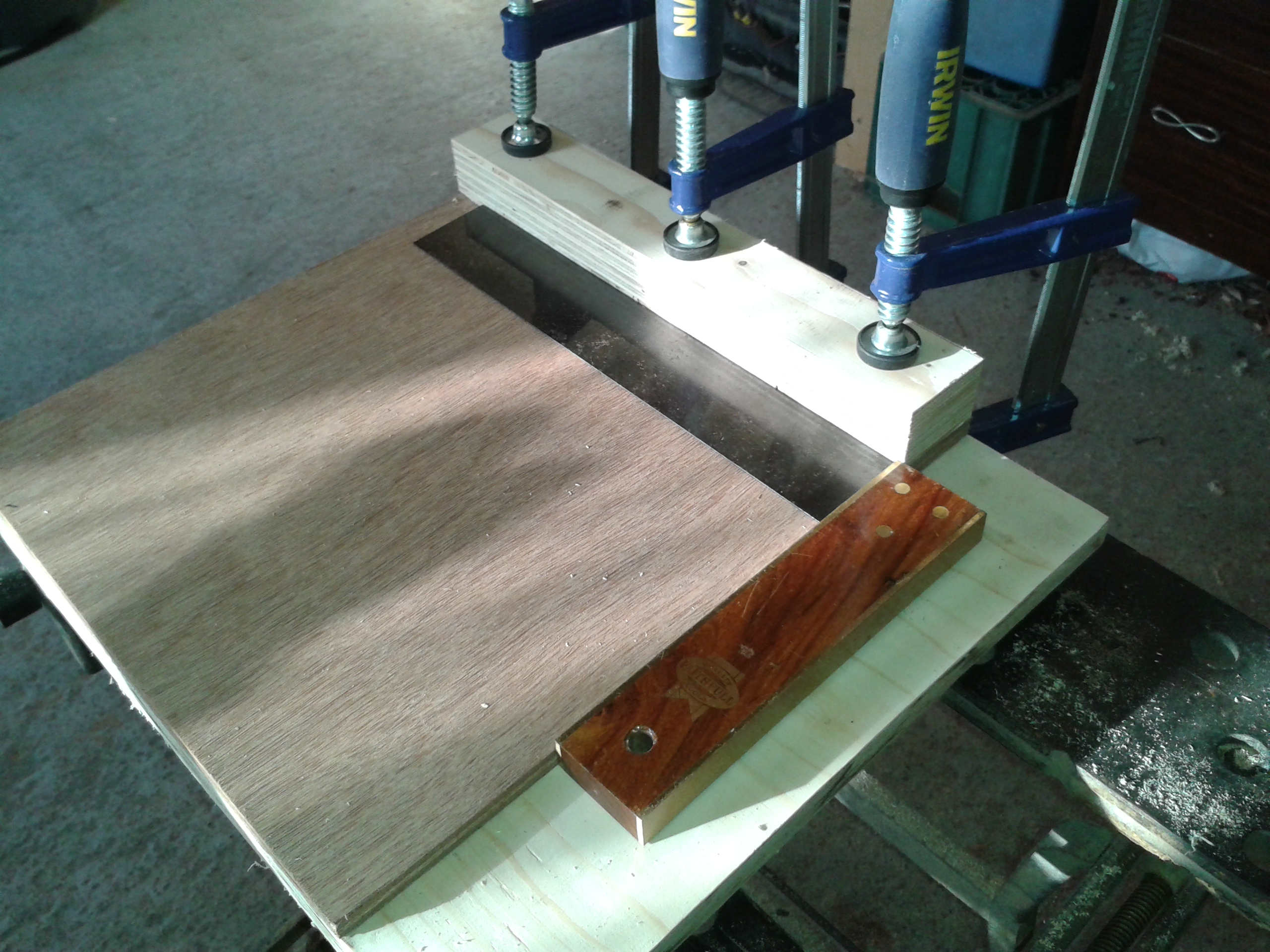 I began by laminating two boards together for the base, one smaller than the other so that the plane will have something to run up against.