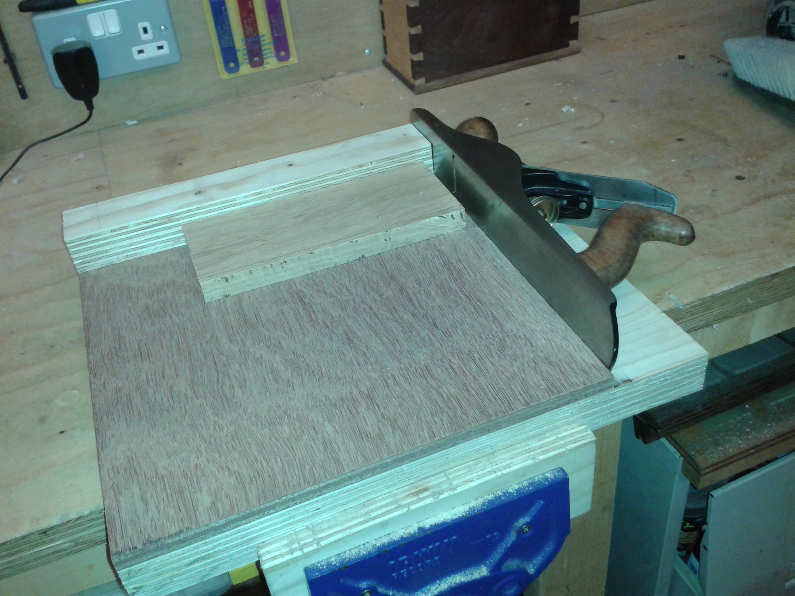 So, from scraps of plywood I found around the shop, I have knocked together a reasonable attempt at a bench hook / shooting board combo.